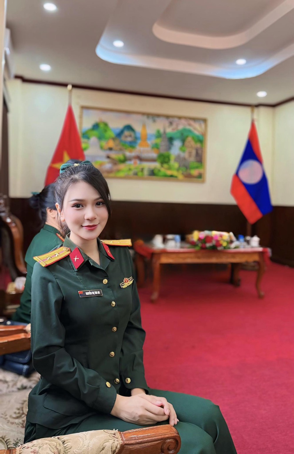 Không chỉ xuất hiện ở sân khấu chính, hình ảnh của cô còn được ghi lại trong các buổi giao lưu tại khu diễu binh, nơi nghệ sĩ Việt – Lào trao cho nhau nụ cười, những lời chúc và những khoảnh khắc đầy tình thân đã góp phần tôn vinh ý nghĩa của sự kiện 50 năm Quốc khánh Lào.
